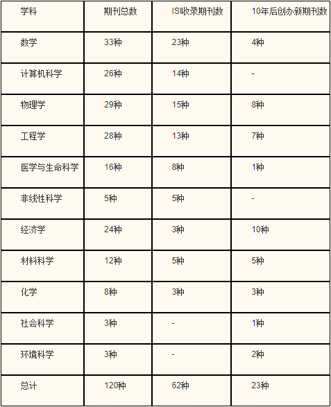 WorldSciNet全文电子期刊学科领域及分布:(由于学科交叉,各分学科期刊总数之和及ISI收录期刊数总和大于实际期刊总数及ISI收录期刊数。)